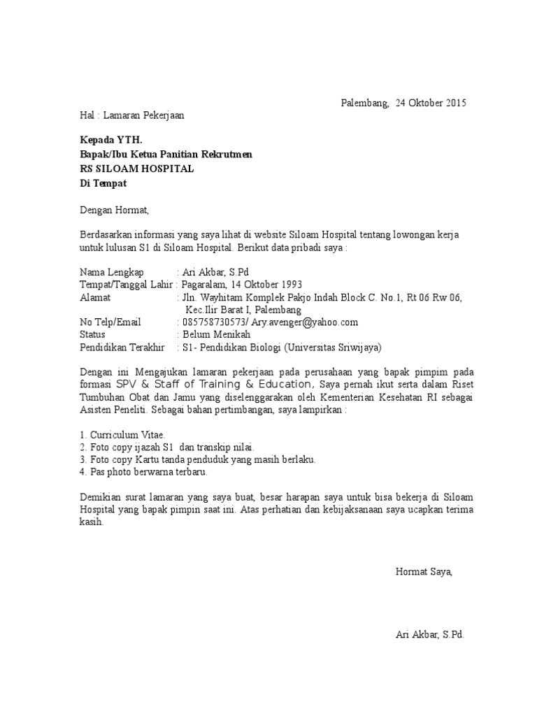 Surat Lamaran Pekerjaan Rs Siloam Hospitals from imgv2-2-f.scribdassets.com Surat pengantar yang dipakai dalam koneksi. Contoh surat lamaran kerja yang baik dan benar untuk dijadikan referensi dalam usaha mencari kerja di sebuah perusahaan sesuai dengan keahlian kamu. Bagi yang ingin melamar pekerjaan sebagai perawat di rumah sakit siloam atau di rumah sakit lain, silakan gunakan template ini. Contoh surat lamaran kerja sebagai security diatas merupakan salah satu contoh dari surat lamaran kerja untuk di rumah sakit. Dan saya akan bekerja dengan serius, baik dalam satu tim ataupun perseorangan, sehingga dapat mempertahankan dan meningkatkan kualitas pelayanan di rumah sakit ini. Surat lamaran kerja di rumah sakit. Untuk menghidupi keluarga anda, memenuhi kebutuhan istri, kebutuhan dan biaya sekolah. Berdasarkan iklan lowongan pekerjaan dari rumah sakit irham husada, pada harian republik tanggal 15 juli 2020, saya mengajukan diri untuk melamar pada posisi.